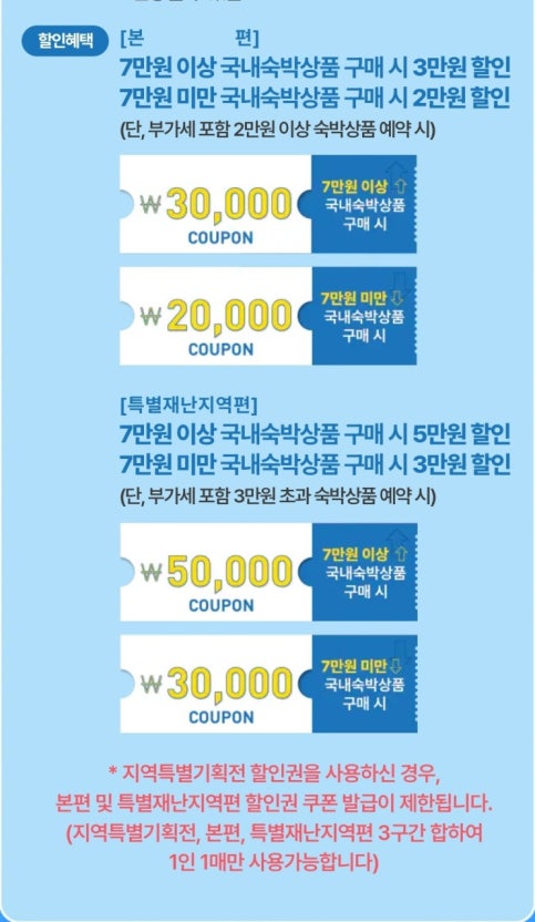 - 7만 원 미만 숙박: 2만 원 할인