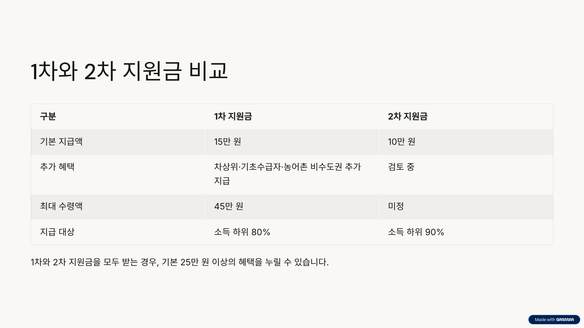 2차 지급에서 받는 10만 원을 더하면, 대상자는 총 25만 원 이상을 받을 수 있고, 지역과 소득 수준에 따라 그 이상 혜택을 누릴 수 있습니다.