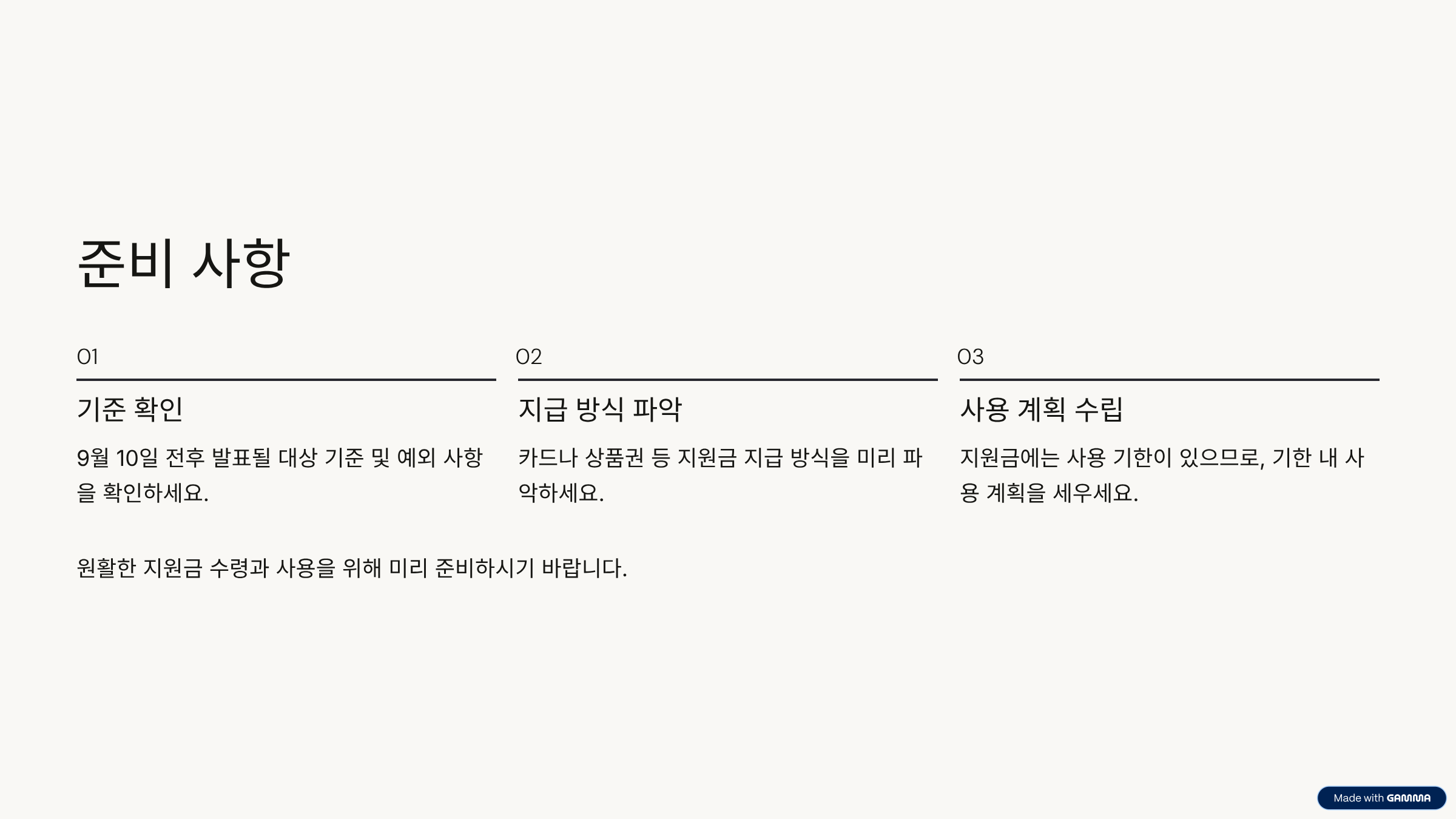 - 지원금 지급 방식(카드·상품권 등)을 미리 파악해, 결제에 지장이 없도록 준비하세요.