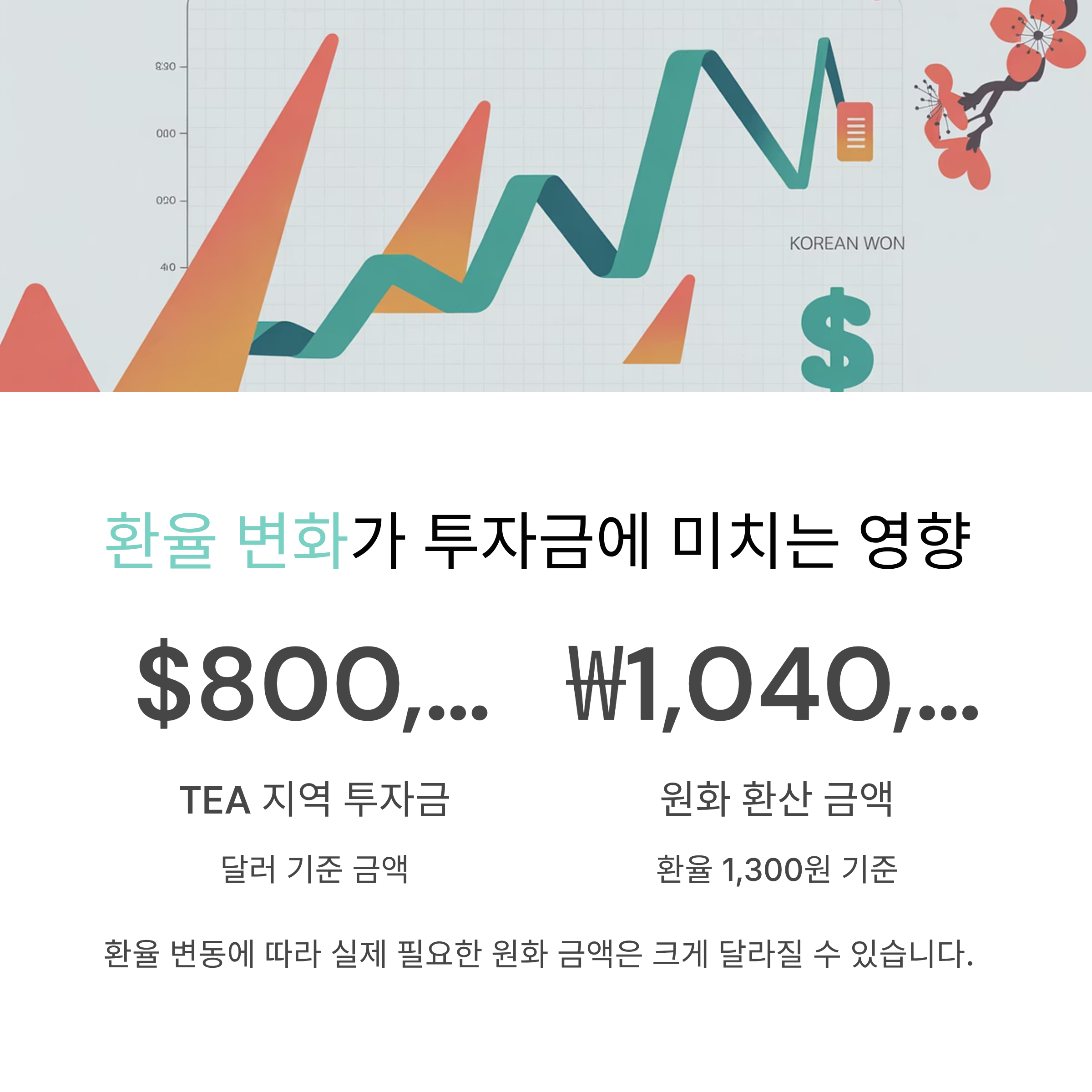 TEA 지역 투자금 80만 달러는 한화 약 10억 4천만 원이며,