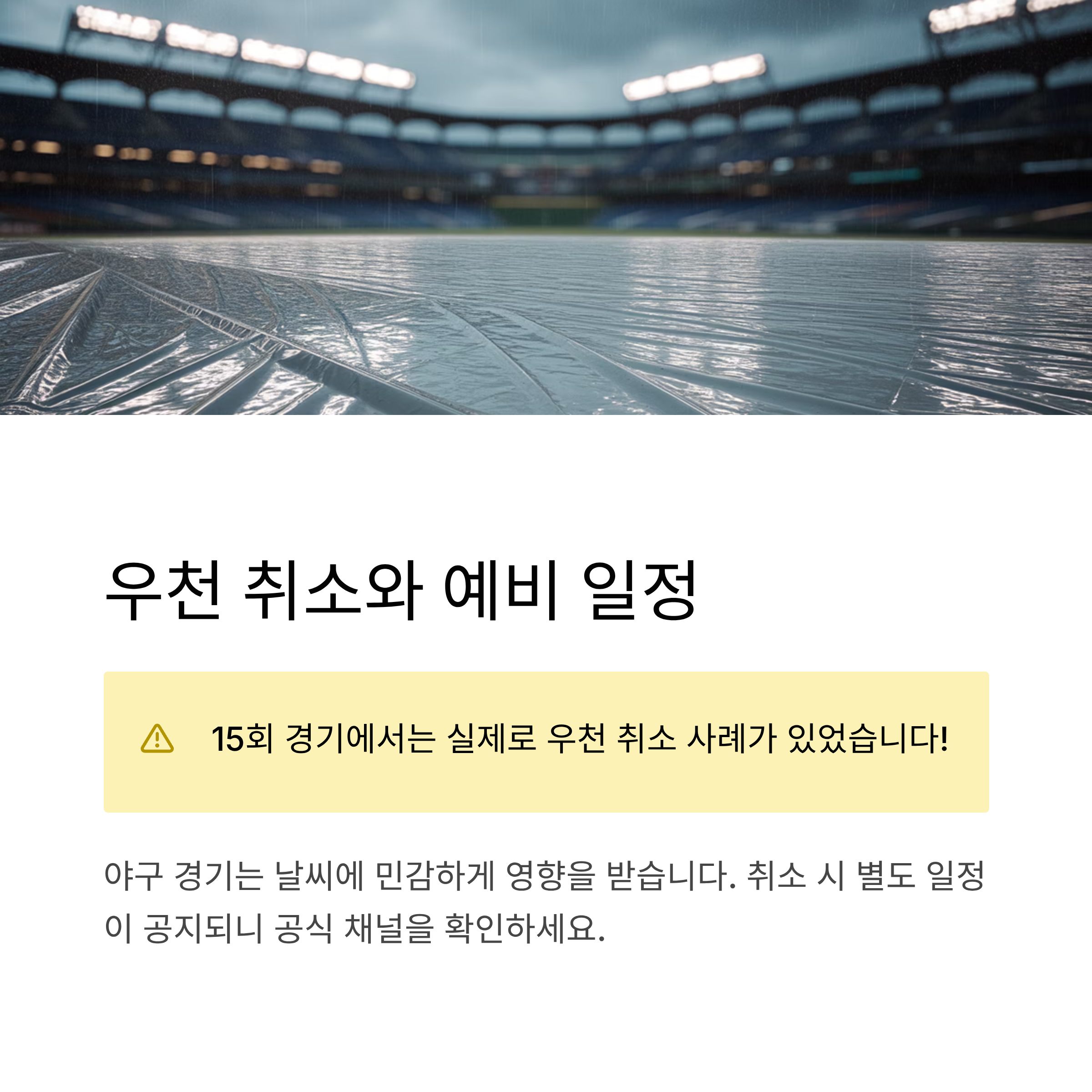 특히 15회 경기에서는 실제로 취소 사례가 있었는데, 이후 일정은 별도로 공지됩니다.