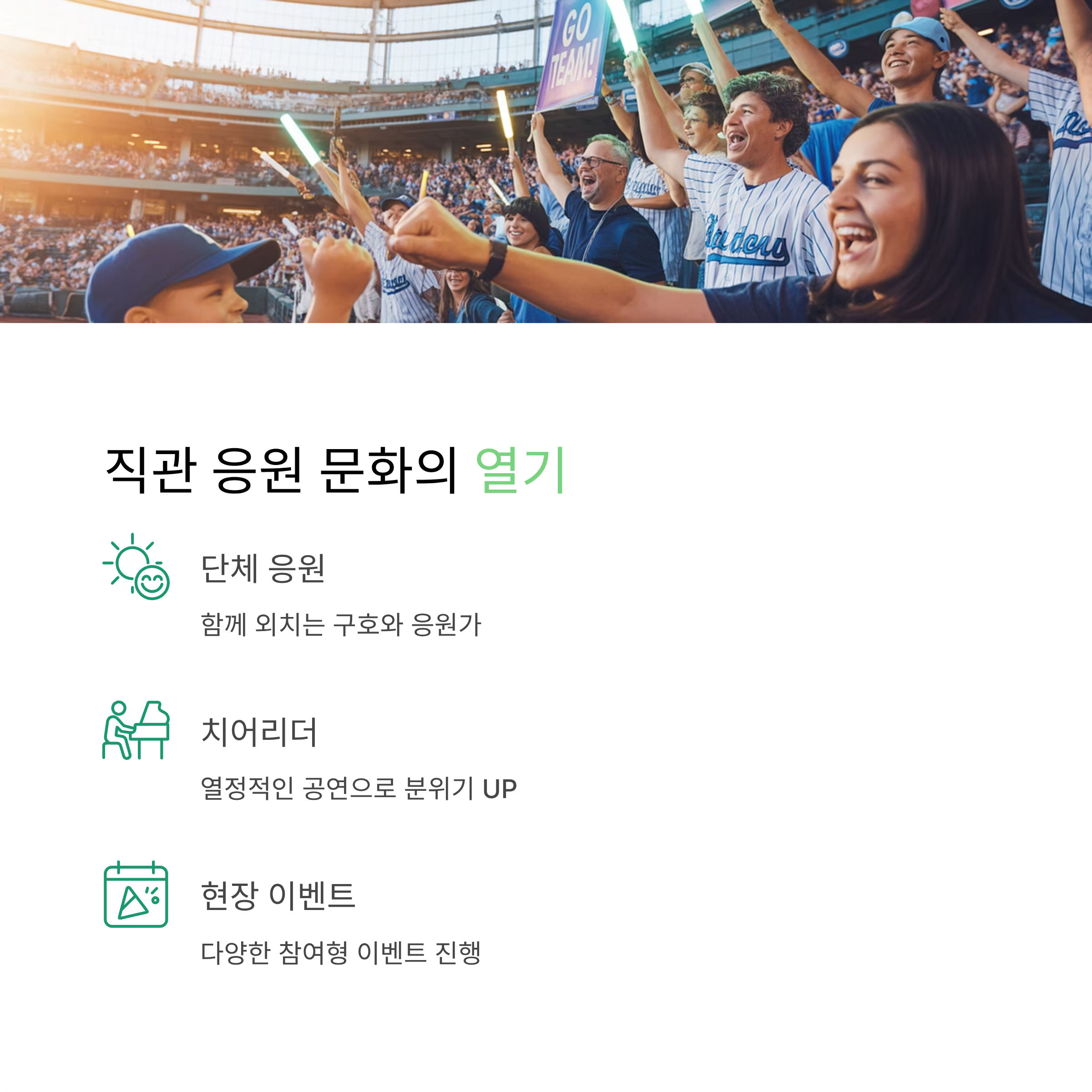 단체 응원, 치어리더 공연, 현장 이벤트 등으로 생생한 열기를 느낄 수 있습니다.