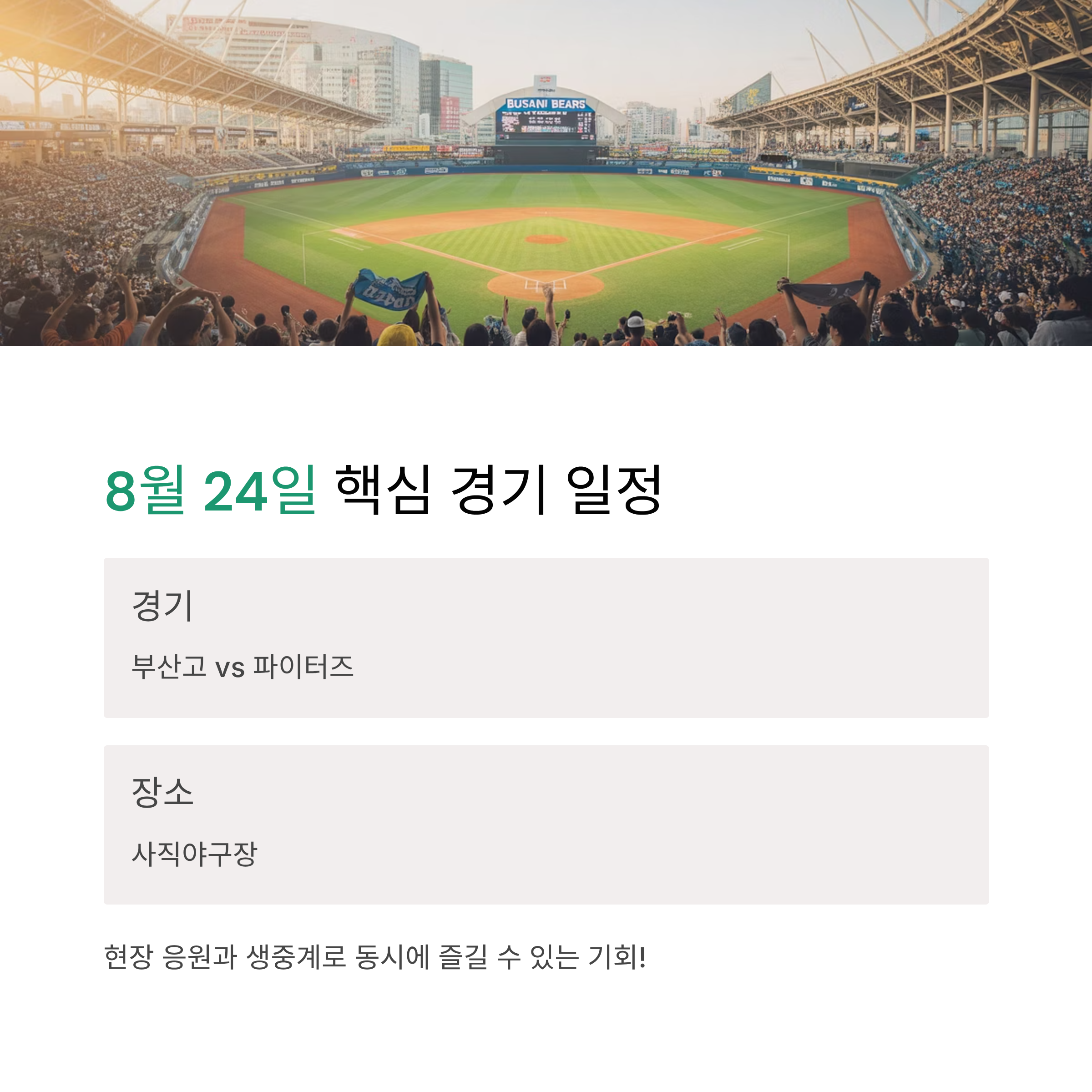 핵심 일정은 8월 24일 사직야구장에서 열리는 부산고 vs 파이터즈 직관 경기입니다.