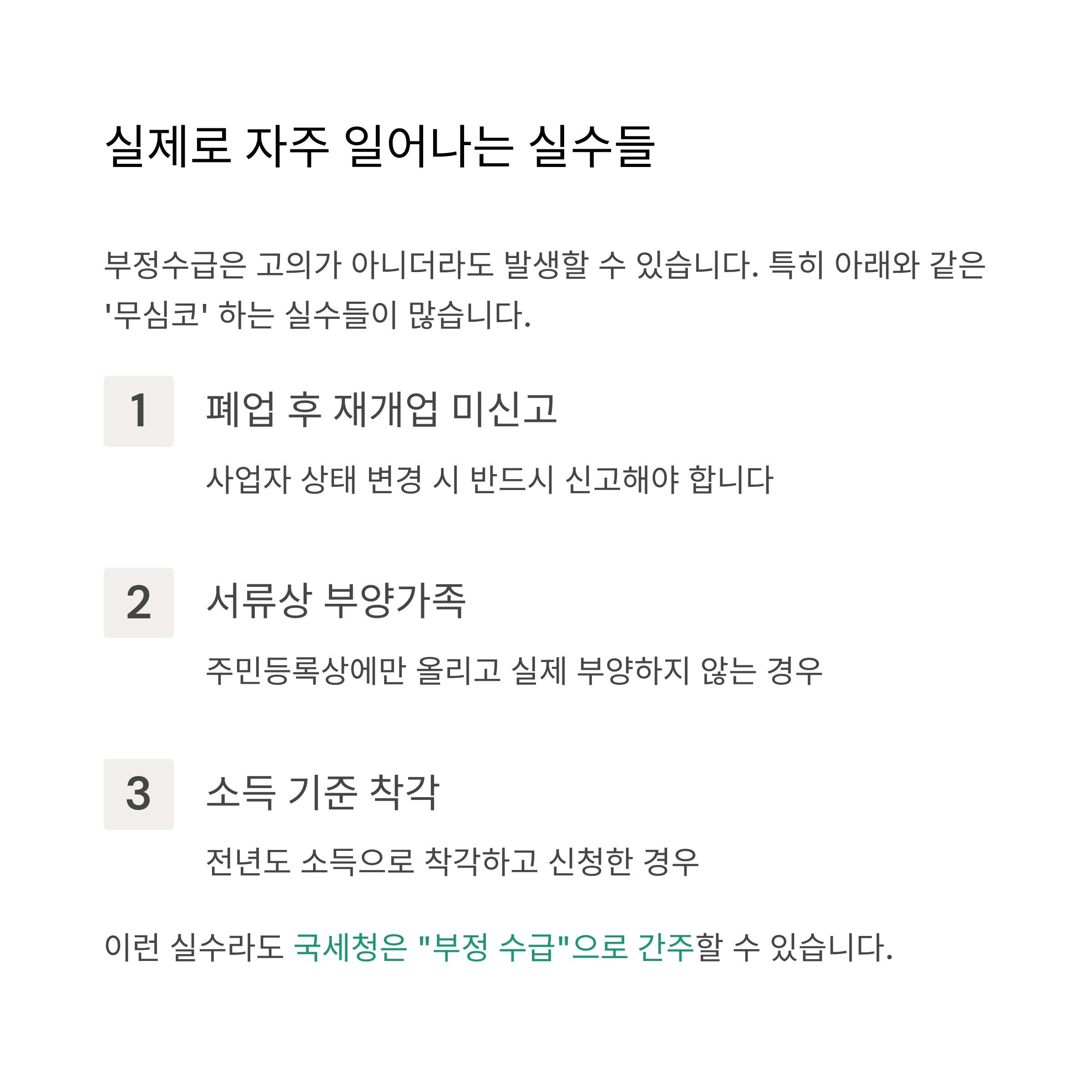 이런 실수라도 국세청은 "부정 수급"으로 간주할 수 있으니 항상 조심해야 합니다.