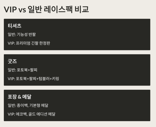 레이스팩 구성은 티켓 종류에 따라 조금씩 다르며, VIP 티켓일수록 굿즈가 더욱 풍성합니다.