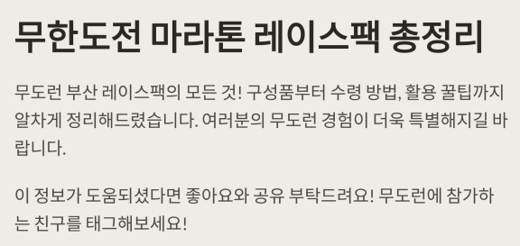 실제 수령한 참가자들의 후기에 따르면, 올해 레이스팩은 다음과 같이 구성되어 있어요.