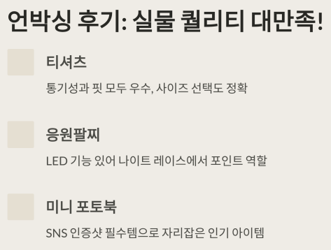 | 액세서리 | 핸드타올, 방수 스티커, 응원팔찌 |