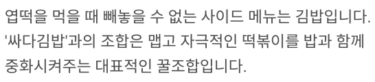 맵고 자극적인 떡볶이를 밥과 함께 중화시켜 주는 효과가 있습니다.