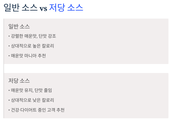 | 추천 대상 | 매운맛 마니아 | 건강·다이어트 중인 고객 |