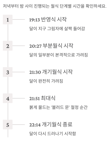 | 부분월식 시작 | 20:27 | 달의 일부분이 본격적으로 가려짐 |