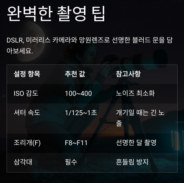 | 조리개(F) | F8~F11 | 선명한 달 촬영 가능 |