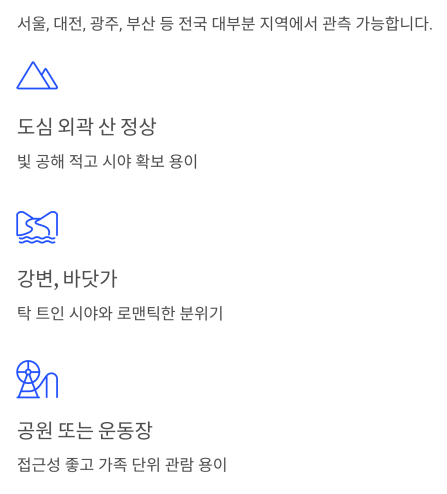 | 도심 외곽 산 정상 | 빛 공해 적고 시야 확보 용이 |