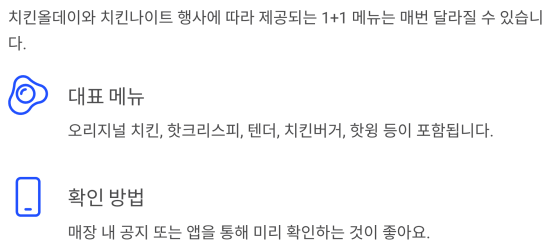 치킨올데이와 치킨나이트 행사에 따라 제공되는 1+1 메뉴는 매번 달라질 수 있습니다.