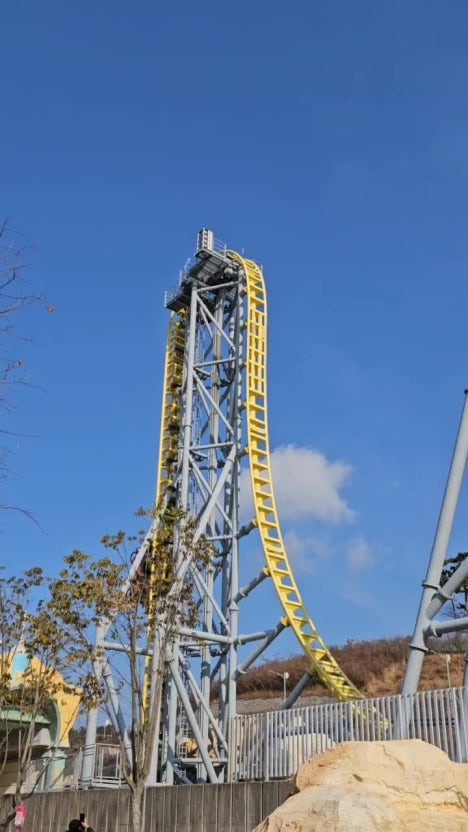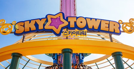 ② 스카이 타워: 국내 최장 ‘상승 시간’을 자랑하는 드롭 타워. 올라가는 데 2분, 하강은 단 3초. 느린 공포가 특징입니다.