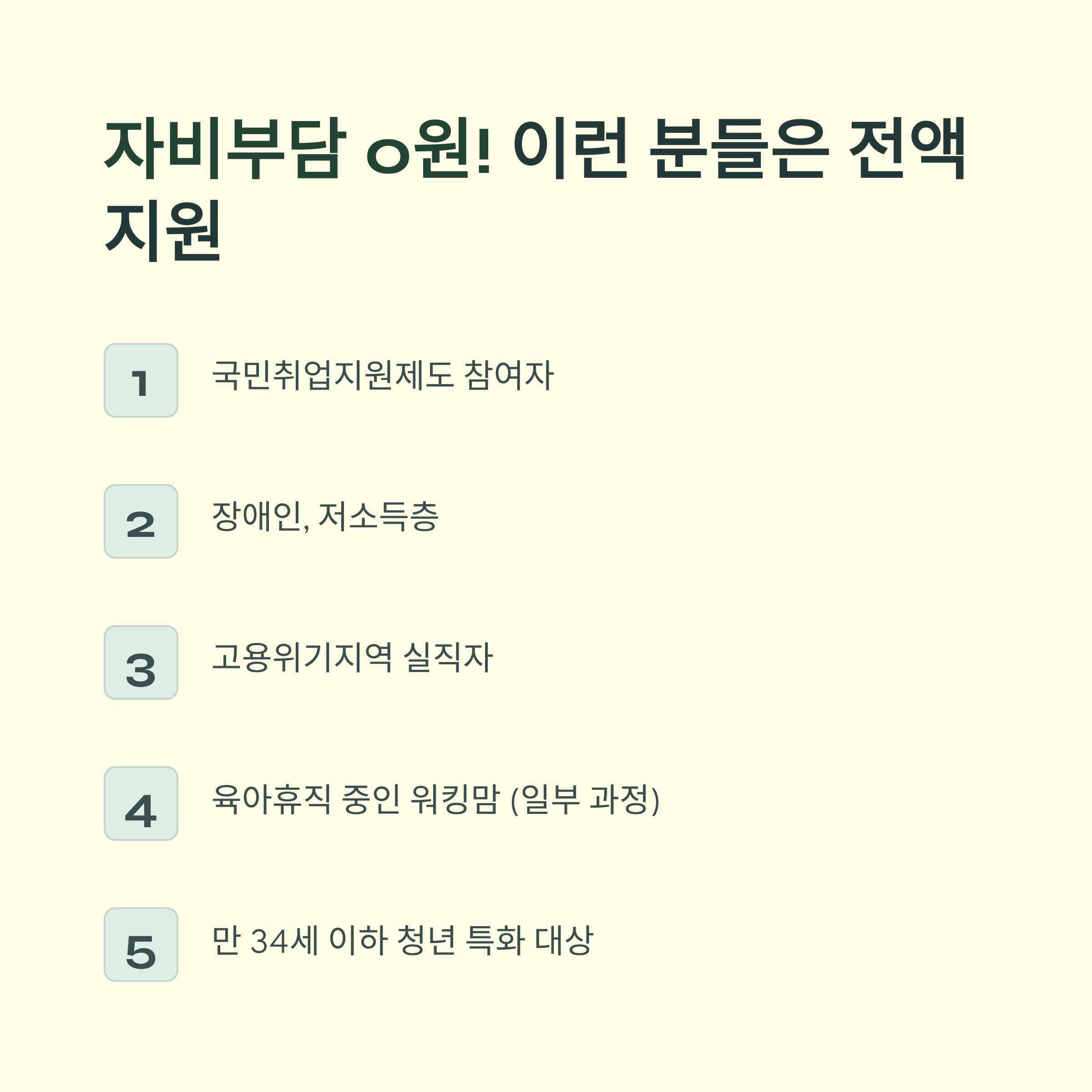 보통 자비부담금은 훈련비의 15~55% 수준이며, 소득이 낮거나 취약계층일수록 부담률이 줄어듭니다.