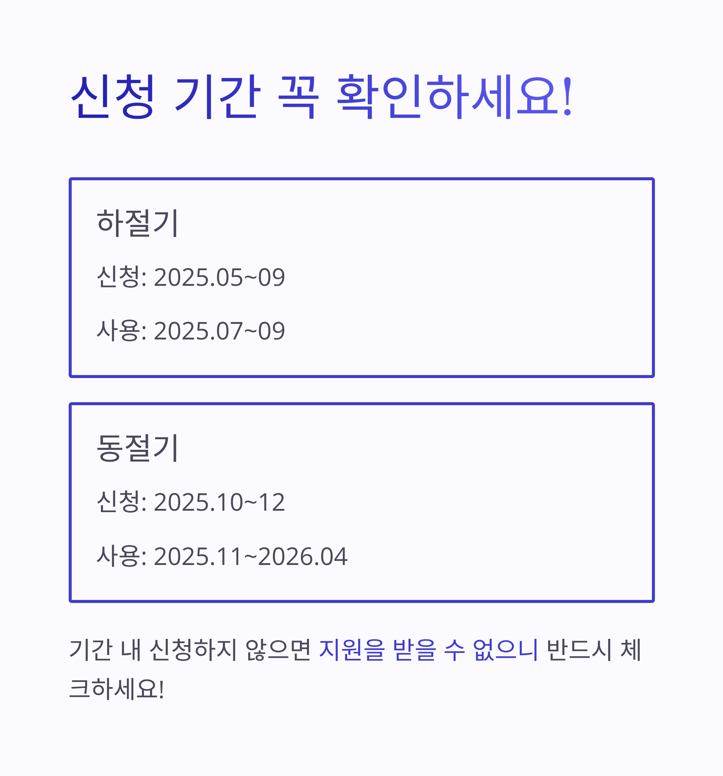 올해 하절기 신청은 2025년 5월부터 9월까지, 동절기는 10월부터 12월까지입니다.