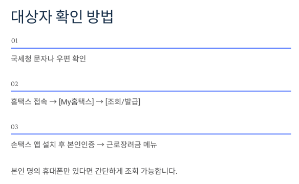 | 손택스 앱 | 국세청 앱 설치 후 본인인증 → 근로장려금 메뉴 확인 |