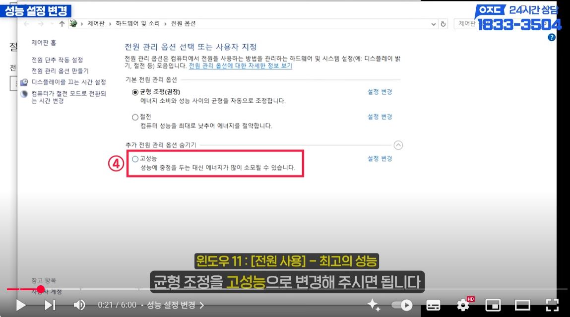 전원 옵션을 ‘고성능’으로 변경