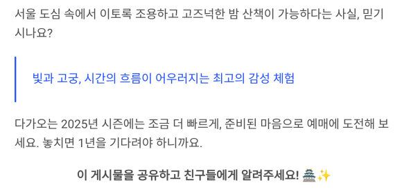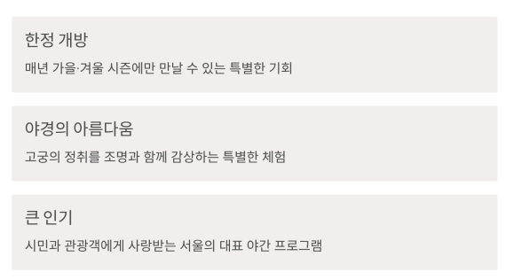 | 혜택 | 궁 내부 조명과 다양한 야간 콘텐츠 제공 |